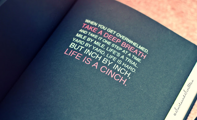 "When you get overwhelmed, take a deep breath and take it one step at a time.Mile by mile, life's a trial. Yard by yard, life is hard. But inch by inch,LIFE IS A CINCH."